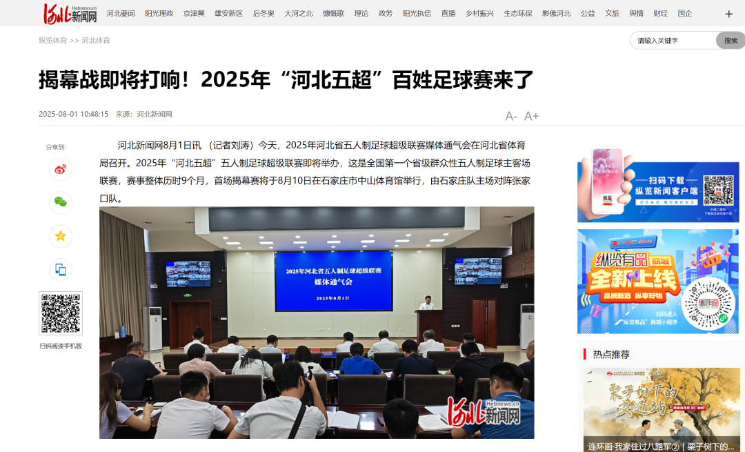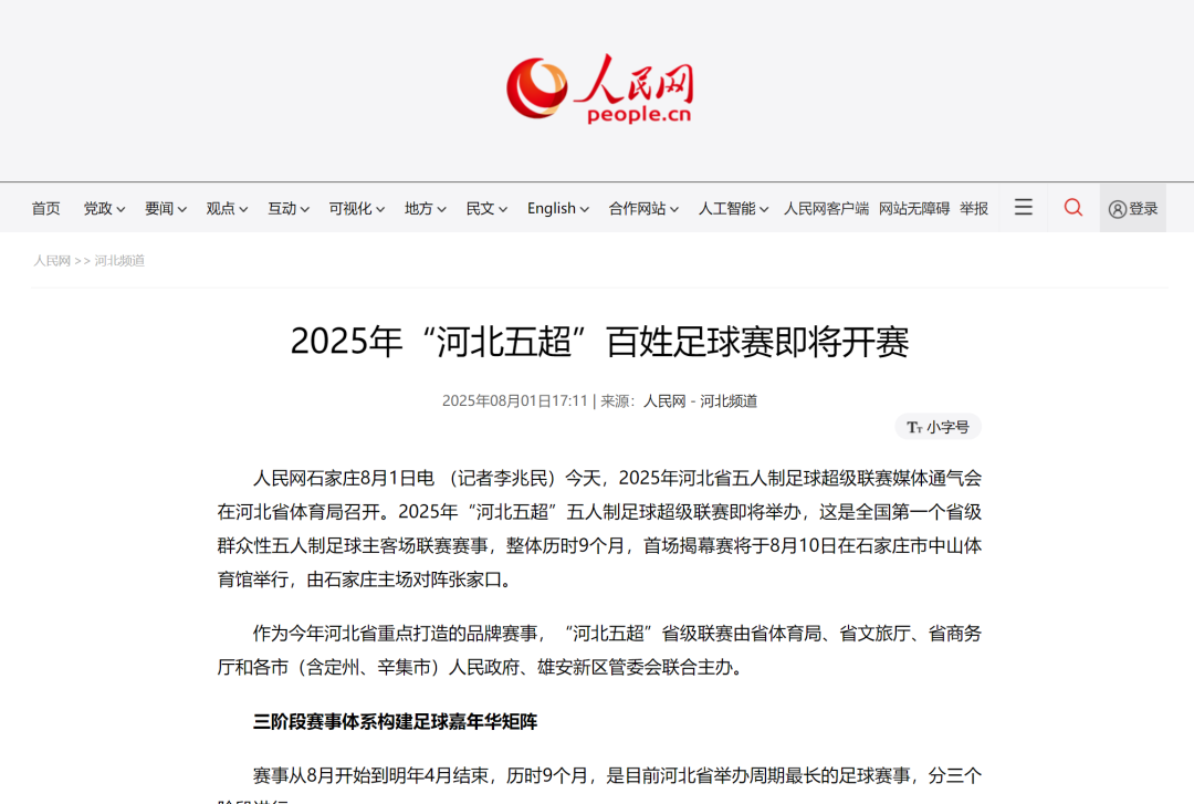 8月1日,人民网·河北频道率先发声,以《2025年“河北五超”百姓足球赛即将开赛》一文,表示“这是全国第一个省级群众性五人制足球主客场联赛赛事”,重点解读8月10日石家庄vs张家口的揭幕战安排,以及三阶段赛程设计的创新性,肯定其在推动足球普及、激活全民健身中的示范意义。