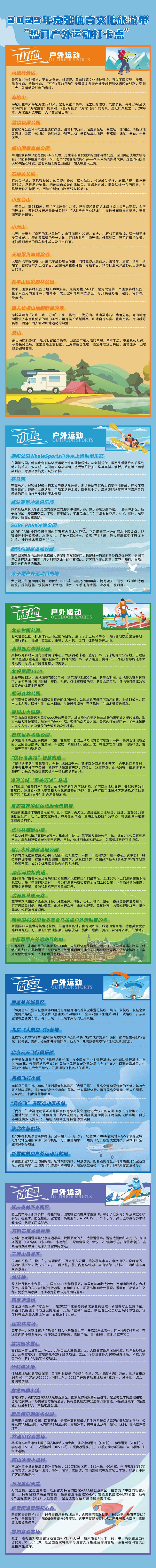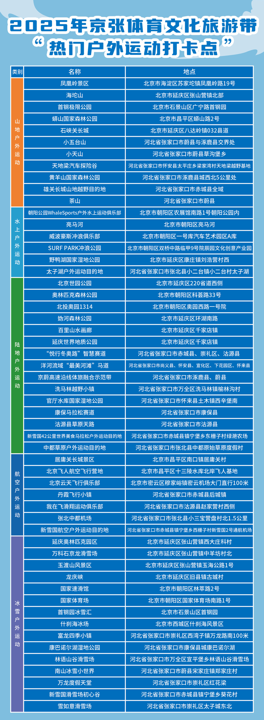 2025年京张体育文化旅游带“热门户外运动打卡点”发布 来源:体育生活报 时间:2025-07-08 7月5日,2025(第五届)京张全季体育旅游嘉年华在张家口市崇礼区富龙四季小镇启幕!启动仪式上,河北省体育局发布了2025年京张体育文化旅游带“热门户外运动打卡点”,共计54个打卡点涵盖山地、水上、陆地、航空及冰雪等多元户外运动形式,为体育旅游爱好者提供全新指南。具体打卡点及介绍如下: 责任编辑:河北省体育局