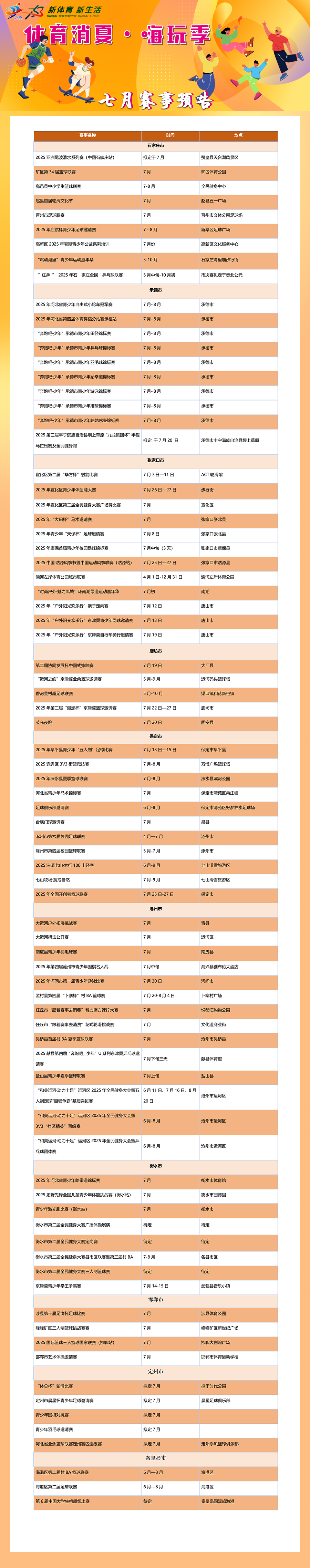 体育消费季 | 嗨玩七月,热力不减!快收下这份赛事预告 来源:财务产业中心 时间:2025-07-14 2025(第六届)河北省体育消费季“体育消夏•嗨玩季”专项活动在全省各地火热进行,小编特地为大家准备了七月份赛事预告,快快行动起来吧! 责任编辑:河北省体育局