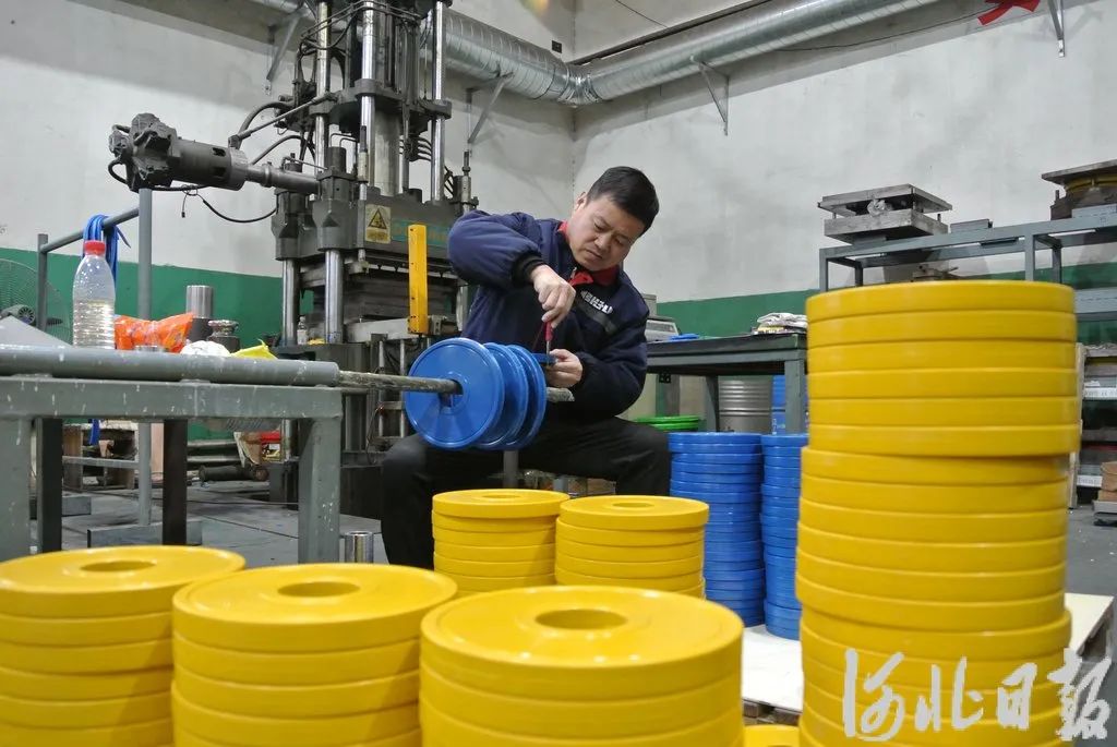 11月19日,走进位于泊头市的河北张孔杠铃制造有限公司生产车间,记者看到,工人将一片金属芯放入注胶机的模具中,设定程序后按下操作按钮。注胶、硫化、开模、脱模……40分钟后,一个1.5公斤重的黄色杠铃片呈现在眼前。