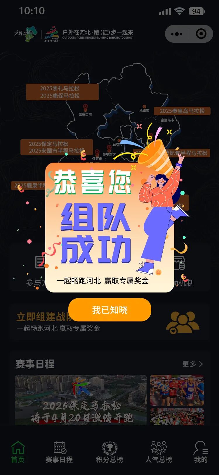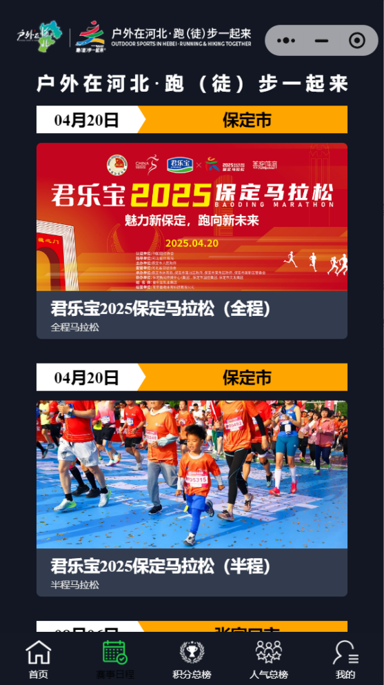 “户外在河北”小程序是河北省体育局结合“户外在河北·跑(徒)步一起来”活动,全新推出的集“赛事资讯、战队组建、积分查询、跟着赛事游河北”等板块内容于一体的户外运动综合信息服务平台。截至目前,共有保定马拉松、秦皇岛马拉松、康保马拉松、衡水湖马拉松、曹妃甸半程马拉松、崇礼马拉松、安国市半程马拉松、鹿泉半程马拉松等8场赛事加入,时间将从4月持续至11月,预计全年吸引跑者超过10万人。