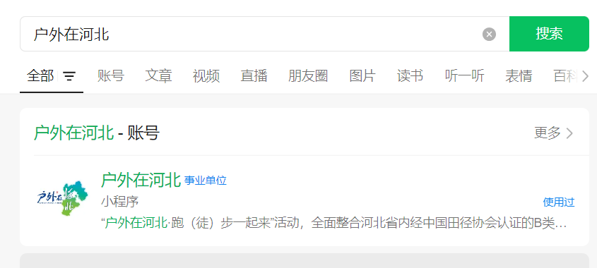 —— 快来查看这份使用说明书 —— PART.01 搜索、关注小程序 打开微信搜索框,选择小程序 输入“户外在河北” 就能找到!