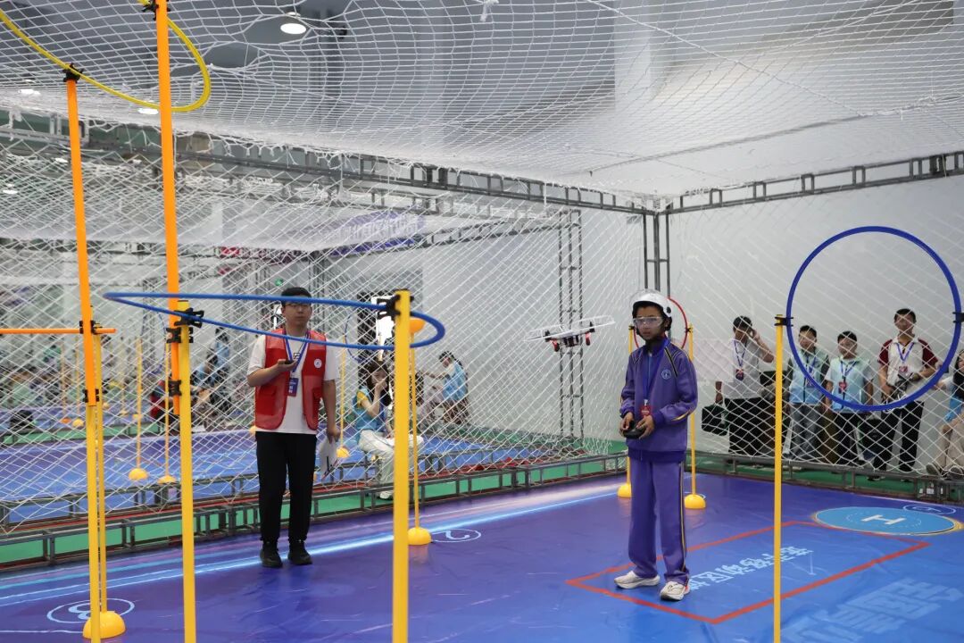 操控类比赛区,无人机在空中灵活穿梭,小选手们手握遥控器,全神贯注地操控着无人机完成各种高难度动作。来自唐山的李同学一个漂亮的"8字绕杆"引得围观群众阵阵喝彩。