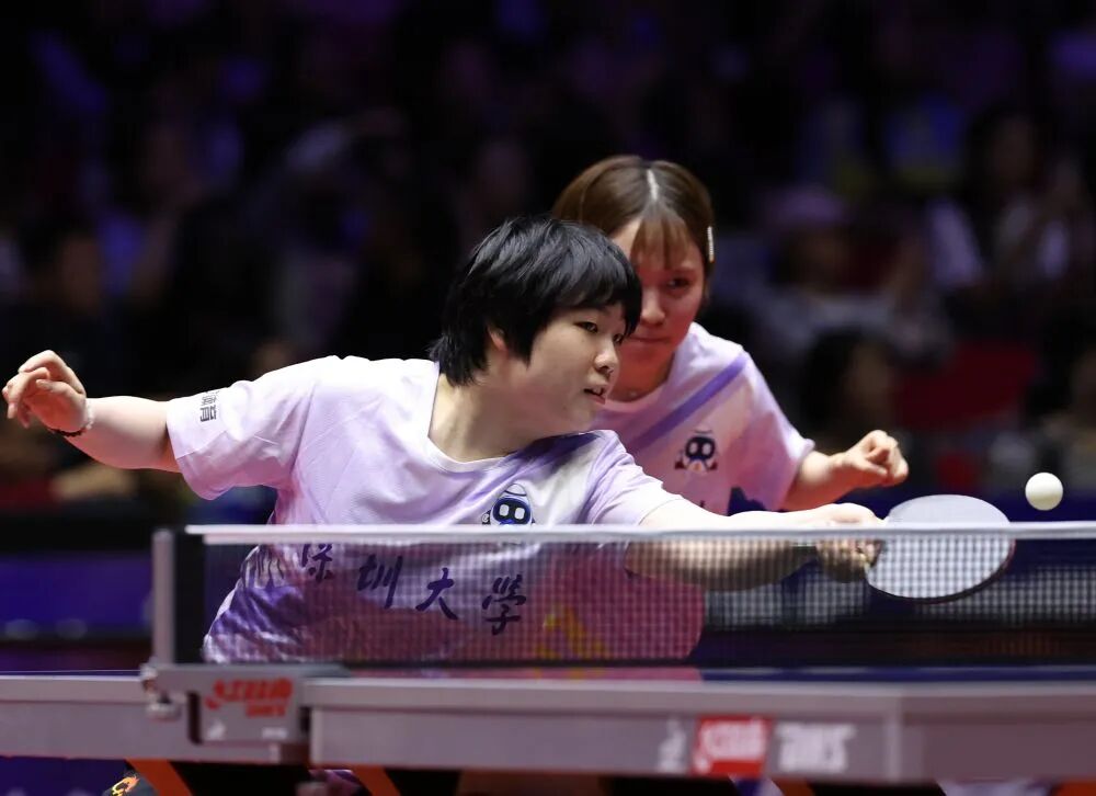 6月11日,樊振东在比赛中回球。新华社记者 杨世尧 摄 当天上午,上海地产集团迎战黄石基地·华新。首场比赛周恺/赵子豪不敌向鹏/薛飞。樊振东出战一单,和林诗栋献上一场高质量对决。双方经历四局苦战后,第五局最后阶段,樊振东率先拿到赛点,以11:8胜出。随后两场,周恺和樊振东分别战胜各自对手,上海地产集团大比分3:1逆转取胜。 当晚上海地产集团与山东魏桥·向尚运动碰面。首场赵子豪/赵钊彦0:3不敌周启豪/林昀儒,樊振东坐镇一单顺利赢下黄友政,但队友赵子豪和赵钊彦先后负于林昀儒和黄友政,上海地产集团大比分1:3告负,目送对手本阶段六连胜。 赛后林昀儒说:“今天双打和周启豪是第二次搭档了,发挥比之前更好一些,进攻和控制方面都不错,比赛状态比前一天更好。周启豪、梁靖崑、王楚钦这些队友都很强,给了自己很多自信。” 当晚的女团焦点战中,深圳大学力克华东理工大学。孙颖莎继续休战,蒯曼和平野美宇扛起大旗,她们先是搭档横扫了张翔宇/王晓彤,之后单打战胜各自对手。王艺迪3:1挑落覃予萱,无力改变局面,深圳大学大比分3:1取胜。 6月11日,蒯曼(左)/平野美宇在比赛中。新华社记者 杨世尧 摄 蒯曼说:“自己今天整体发挥还是不错的,比赛中的关键分都顺利拿到了,不管场上比分多少,自己想到的都去做了。单打比赛还是比较胶着,赢下第一局之后找到了更好的状态。” 第一阶段过后,男团方面山东魏桥·向尚运动、汕头明润、黄石基地·华新、上海地产集团占据前四位,女团方面深圳大学、山东鲁能、上海龙腾、黄石基地·华新占据前四位。