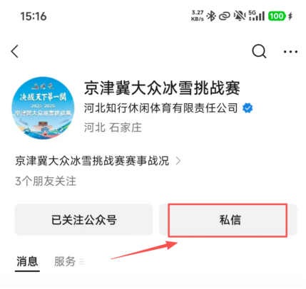 微信搜索并关注 “京津冀大众冰雪挑战赛”微信公众号,获取赛事报名、赛程安排、场地信息等信息。