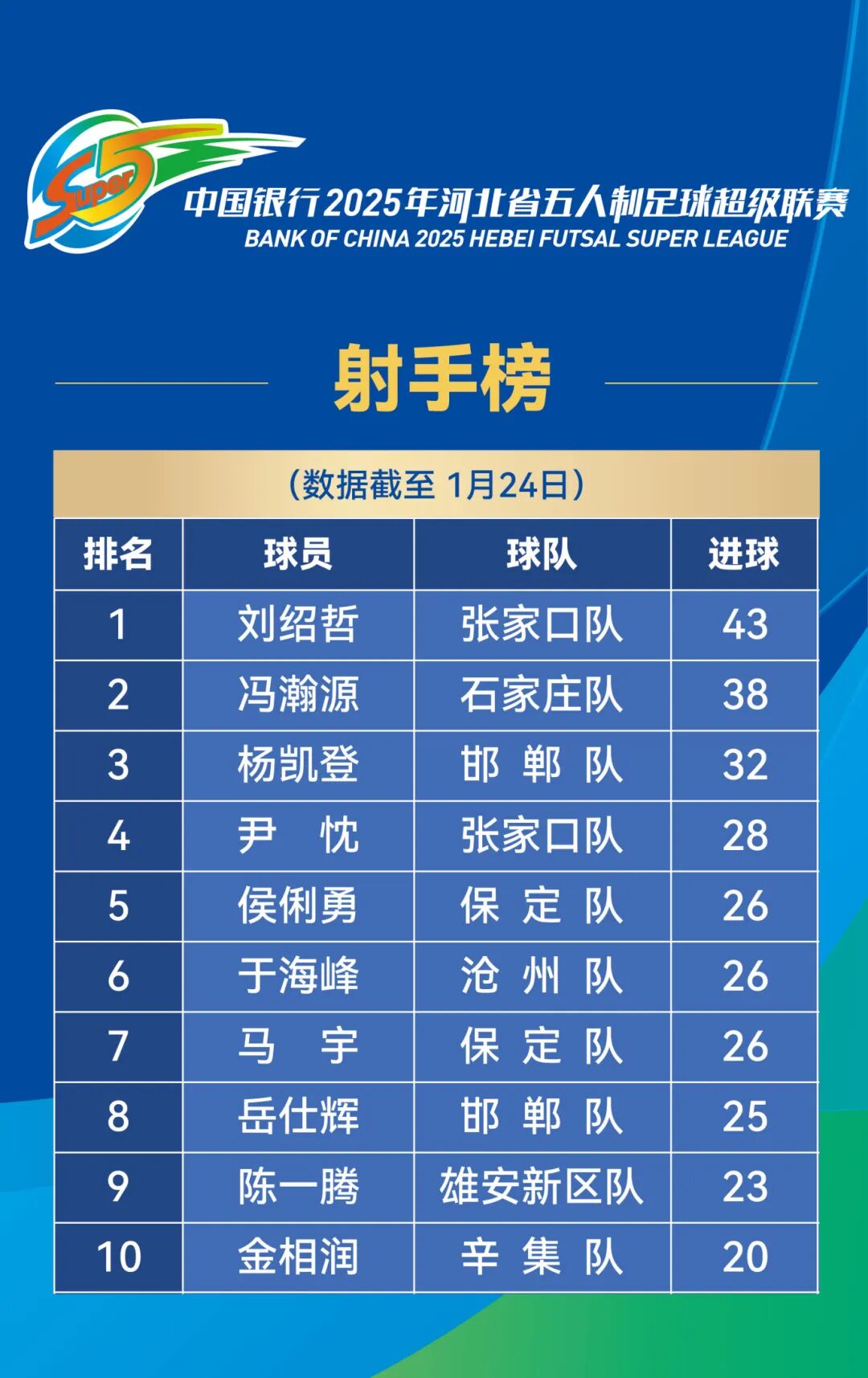 “河北五超”最新积分榜、射手榜来了→ 来源:河北体育微信公众号 时间:2026-01-27 1月24日,“河北五超”第24轮比赛全部结束,积分榜再次迎来变化。最终,邯郸队主场3:6不敌石家庄队,联赛排名跌至第六位。联赛领头羊保定队继续强势表现,客场8:0战胜唐山队;而张家口队则主场“意外”败给承德队,联赛排名也被石家庄队超越。保定队本轮客场以8:0胜唐山队,继续稳定占据积分榜首位,刘绍哲以43粒进球仍占据射手榜榜首。 责任编辑:河北省体育局