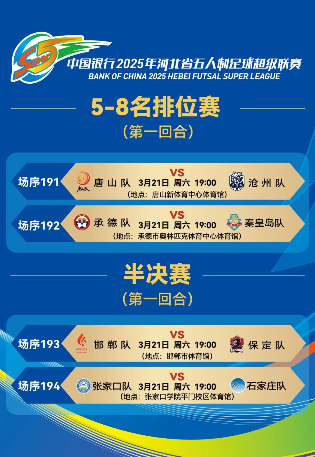 “河北五超”半决赛、5-8名排位赛首回合本周六开战 来源:河北体育 时间:2026-03-19 3月21日(周六),“河北五超”季后赛半决赛第一回合与5-8名排位赛第一回合将同步打响!四强队伍向总决赛发起冲击,剩余四支劲旅为荣誉而战。精彩比赛,一触即发→ 责任编辑:河北省体育局