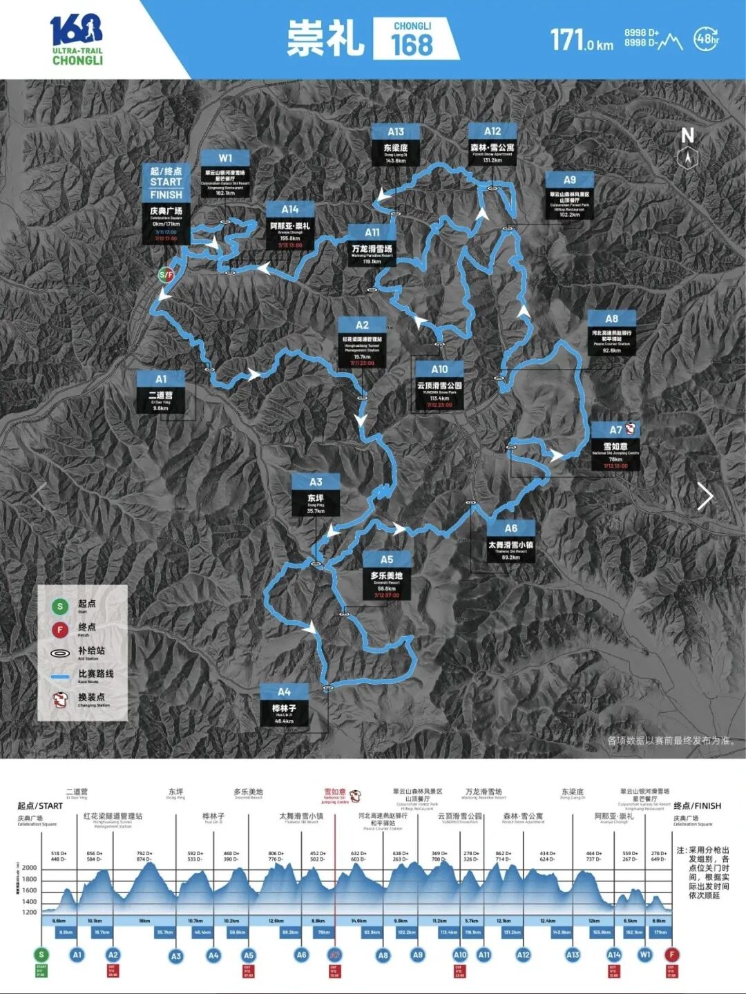 随着越野赛事的发展,100英里逐渐成为越野跑赛事的“黄金标尺”。由于各赛事地形的独特性,赛道长度多为160-170km不等。组委会取“168”谐音“一路发”,注入中国文化寓意,希望各位跑者一路顺一路发,最终铸就了“崇礼168”的赛事IP。