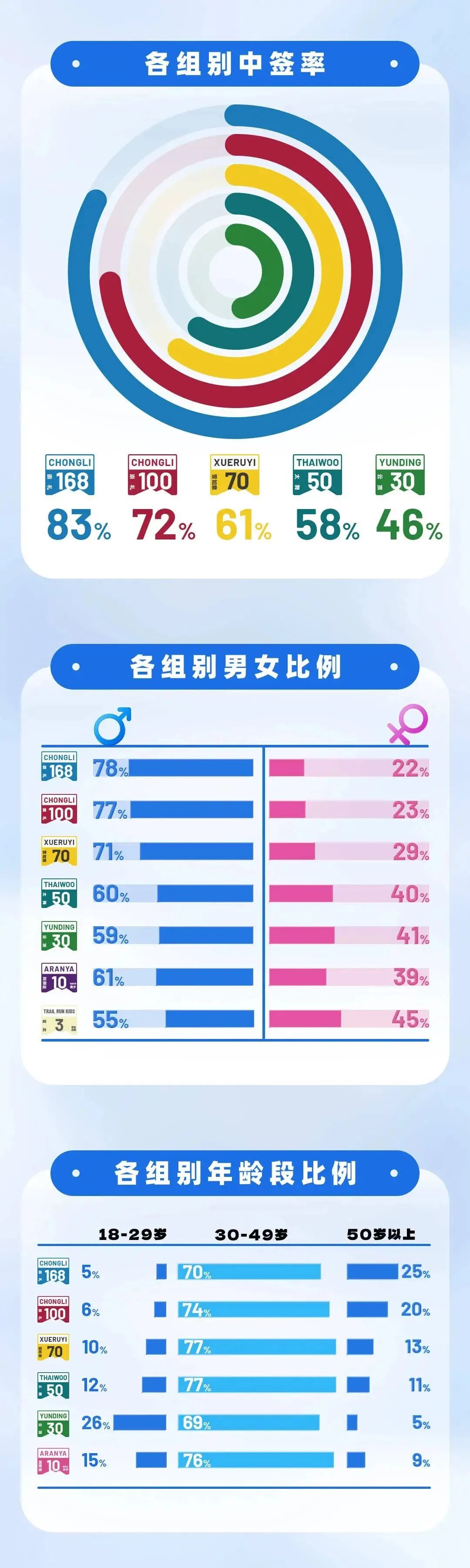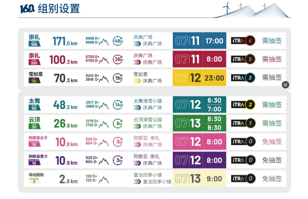 组别命名更“中国”。在组别设置方面,赛事启用了更加中国化的组别命名方式,以“出发场馆”加“里程”的组合方式命名,更加凸显崇礼的文化特色,共设置崇礼168组、崇礼100组、雪如意70组、太舞50组、云顶30组、阿那亚10女子组、阿那亚10青少组和萌娃酷跑3公里、萌娃酷跑1公里共9个里程组。其中太舞50组设置为双人、三人组的团队形式。